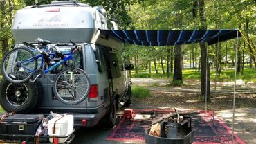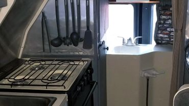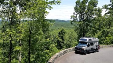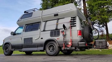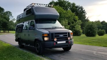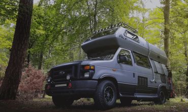 A custom conversion of the classic Airstream B190 Ford van camper. A 1997 V10 with an overdrive transmission and a 2008 nose. We call it the Uwharrie.