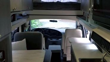 The beautifully updated interior went from tan oak to cool grays. Full interior customization included new flooring, upholstery, vinyl walls, LEDS throughout, custom designed dinette/bed, enlarged bunk over cab with new mattresses, upholstered door panels, custom curtains, sink faucets and even a new toilet. We upgraded to a Pioneer dash unit with Apple and Android CarPlay, installed USB charging stations, added an inverter, solar panels to work with the existing generator. Looking inside, you'll think you're in a brand new RV.